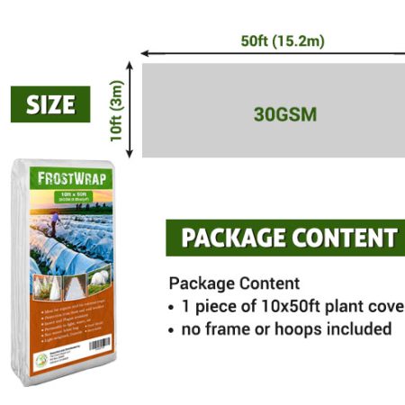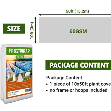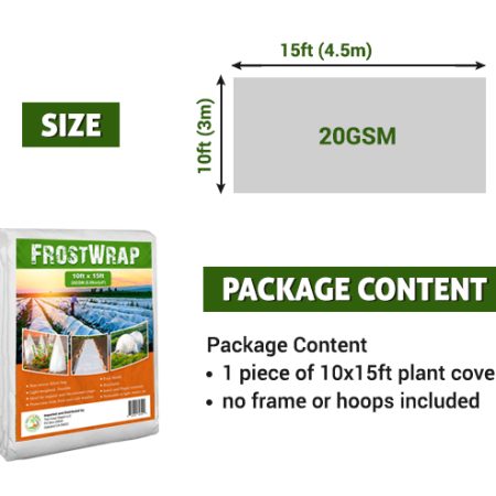 Our standard-size FrostWrap facilitates a large coverage area twice its length and smallest being half of the original. The cover can be wholly used as a garden plant blanket and protect garden plots or cut into different sizes for different use, to cover over the plants such as pumpkins, strawberries, shrub tomatoes, eggplant, pepper and more.